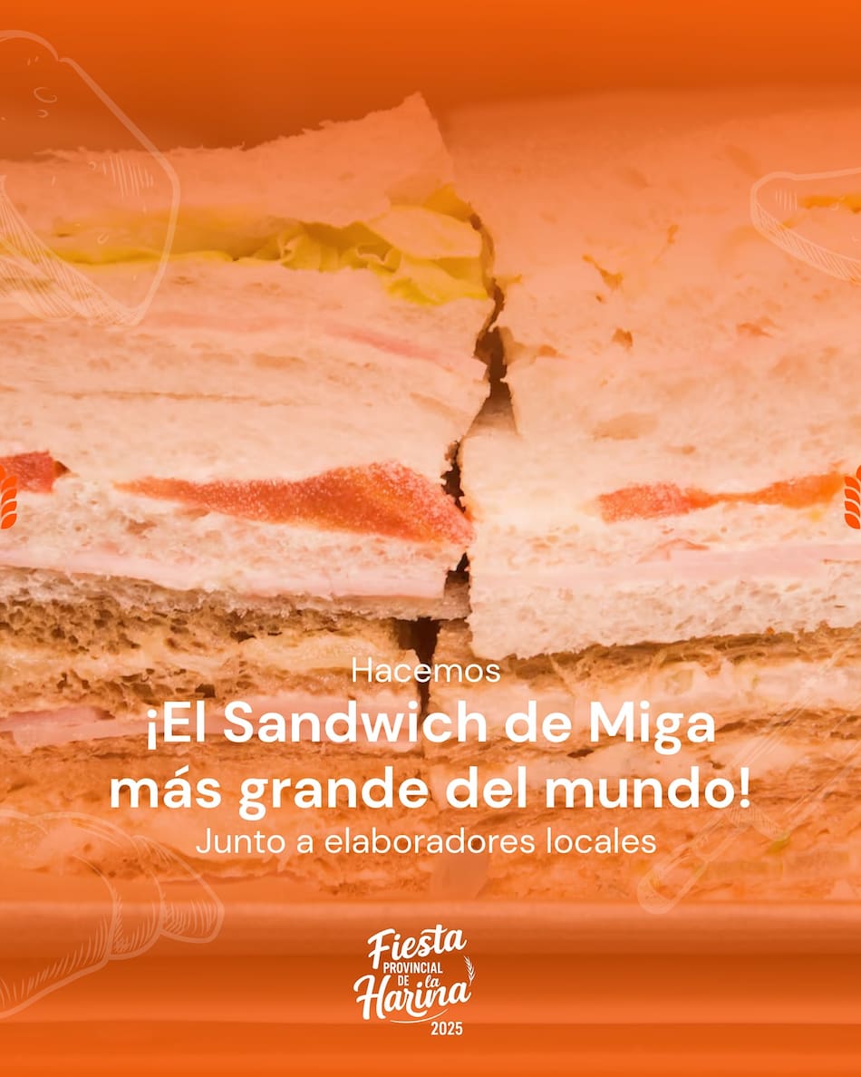 Pero la cita más convocante del año es la Fiesta Provincial de la Harina, que reúne a miles de visitantes con talleres de cocina, espectáculos musicales y degustaciones de productos locales. En este marco, se presenta el plato estrella: un sándwich de miga de más de 2,8 metros de largo, que se convirtió en el emblema gastronómico del pueblo.