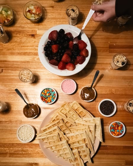 - Waffles recién elaborados con múltiples toppings como dulce de leche, miel, azúcar impalpable, frutas frescas, granas de colores.