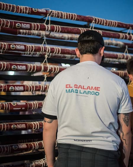El armado del salame gigante lleva semanas de trabajo previo. En los días anteriores al evento, los productores comienzan a unir los tramos en una estructura especialmente diseñada para sostener el peso del embutido, que puede superar los 300 kilos.