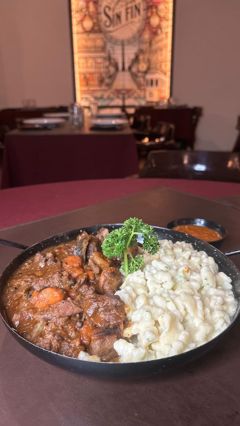 Uno de los platos que vuelve a Sinfin un bodegón único, es su tortilla rellena de jamón, queso y milanesa. También ofrecen fuentones de pasta como fetuccini con salsa de mariscos, mediterránea, bolognesa, entre otras opciones.