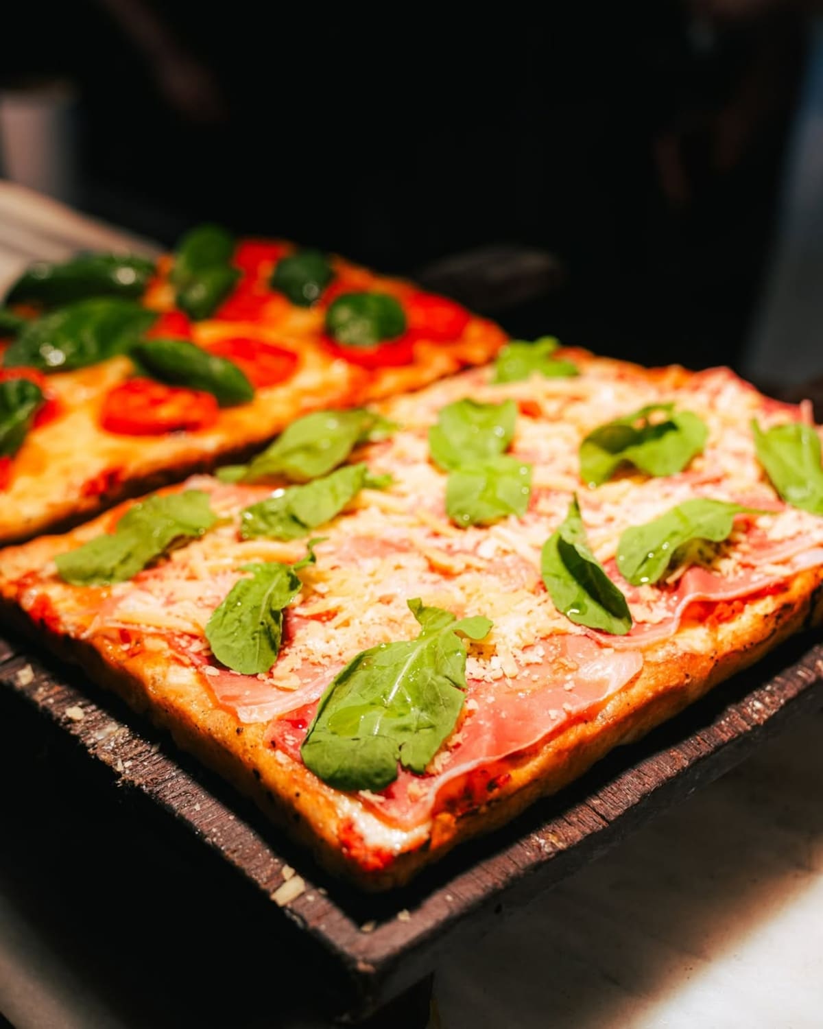 Su principal diferencia está en la forma cuadrada, la masa más fina, crujiente y seca, con bordes apenas marcados, que se cocina a temperaturas más bajas y durante más tiempo. Por eso, quienes disfrutan de una masa más fina que la tradicional al molde encontrarán en esta pizza una opción irresistible.