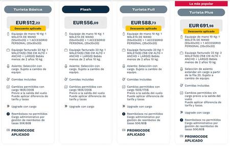 La tarifa más barata es de 512 euros: incluye comidas, un equipaje facturado de 23 kg, sumado a un equipaje de mano de 10 kg y un accesorio personal.