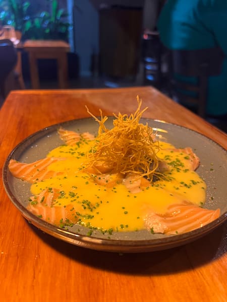 - Tiradito de salmón y maracuyá ($26.000): una de las entradas frías más elegidas. Lleva salmón fresco estilo usuzukuri pichicata, jugo de lima, hilos de camote, crocante y salsa pasión.