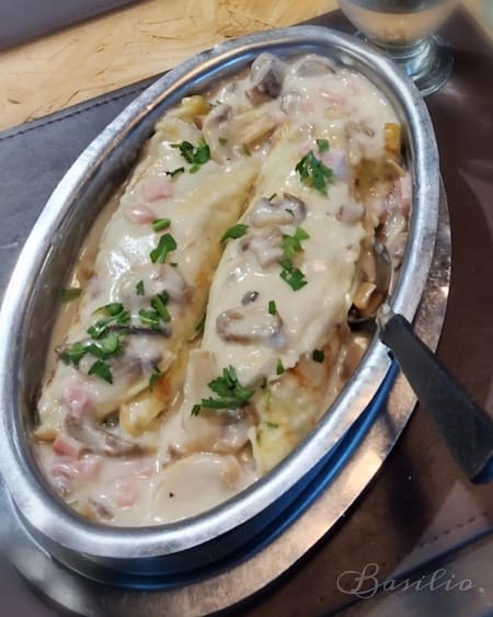 - Bife de chorizo Basilio (con panceta, mozzarella, pimiento rojo en salsa demiglace y verde) con guarnición de papas rústicas: $ 31.700