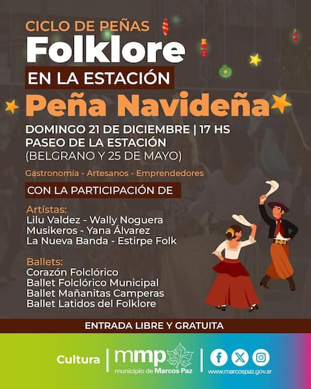 El Ciclo de Peñas es una actividad al aire libre para compartir en familia o con amigos. La jornada contará con artistas invitados y números de ballets folclóricos, que aportarán color y ritmo a una tarde atravesada por el clima festivo de fin de año.