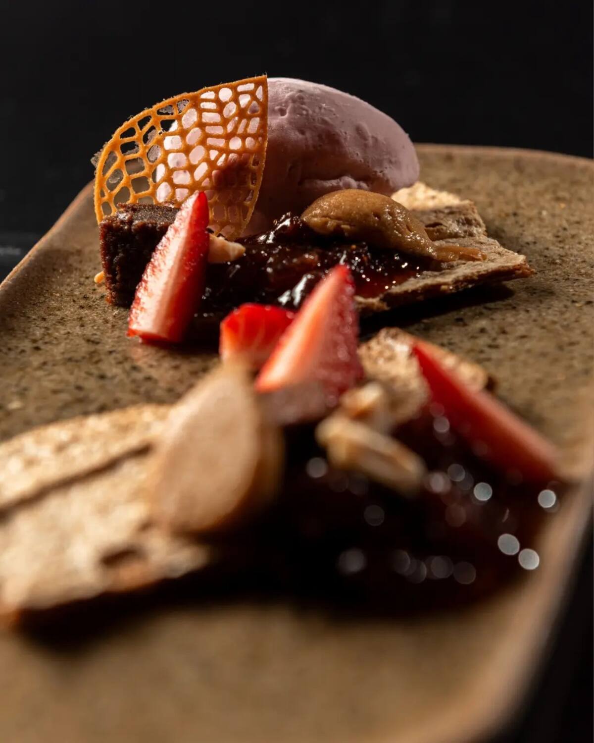 Los postres ocupan un lugar destacado dentro del menú. Frutas trabajadas en conservas, ganaches, infusiones y frutos secos aparecen combinados en distintas texturas.