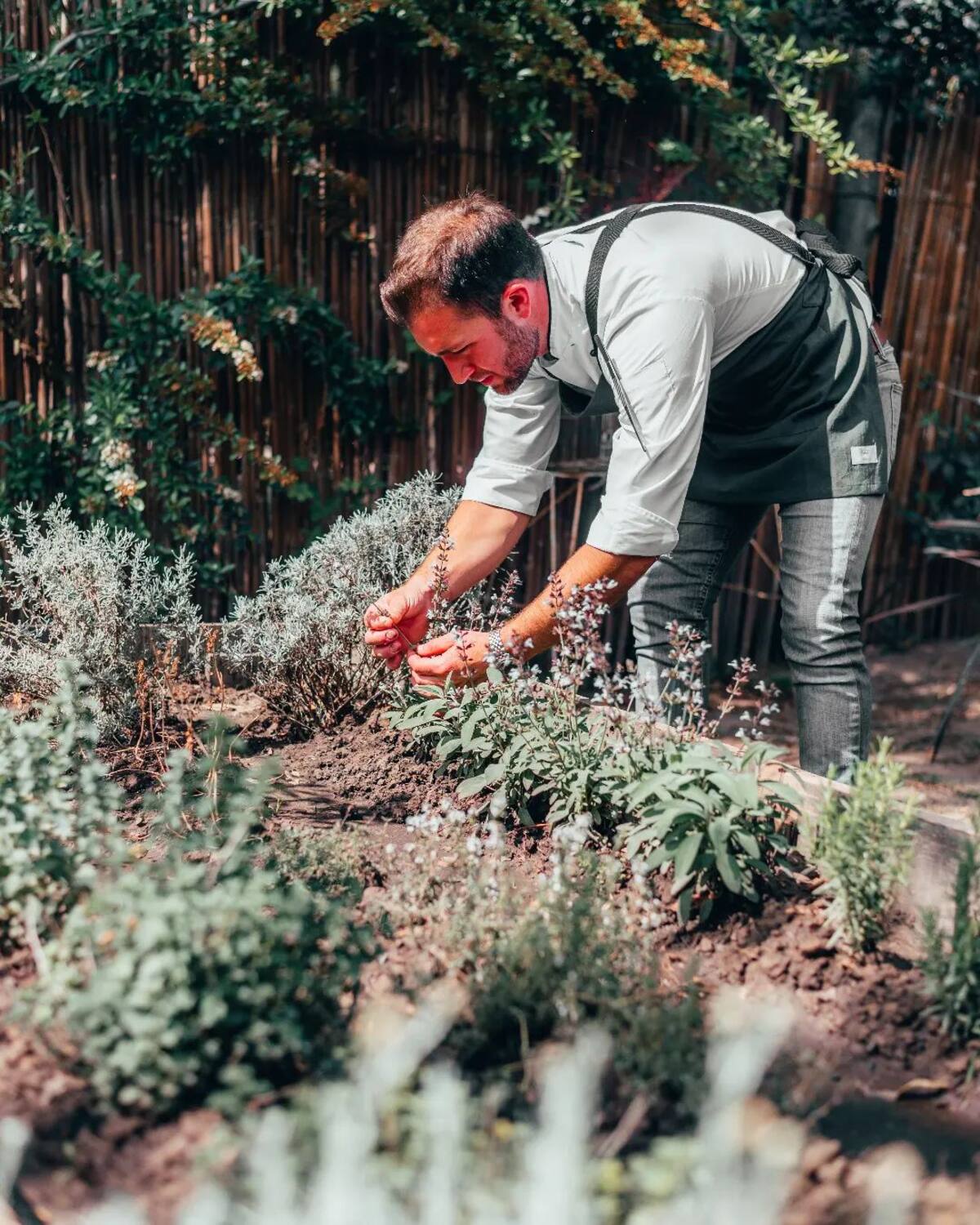 La huerta propia aporta aromáticas, flores comestibles y algunos vegetales específicos, mientras que el resto de los ingredientes proviene de productores locales con los que existe un vínculo directo.
