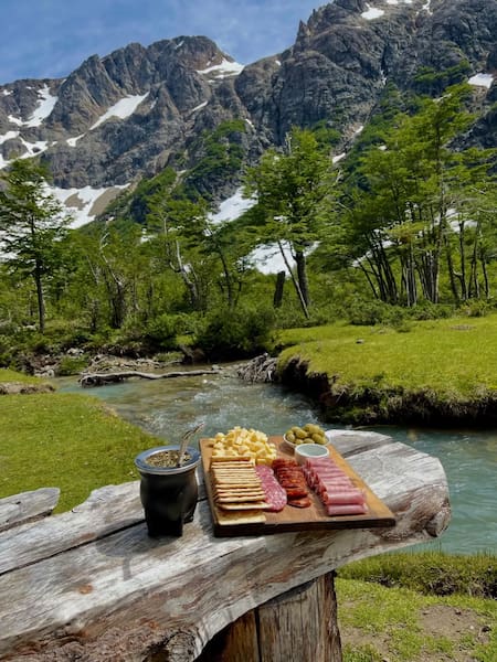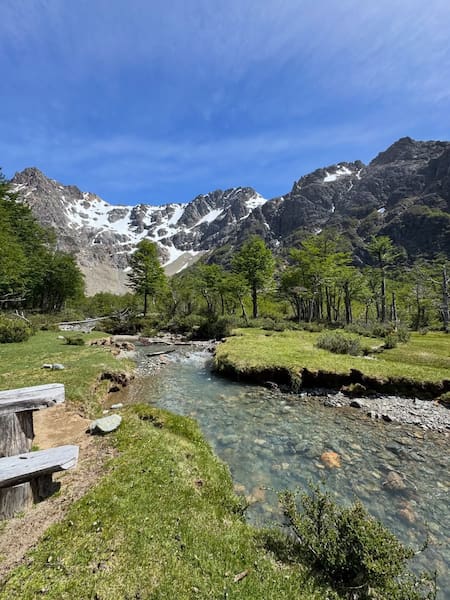 El Refugio Hielo Azul cuenta con cocina, comedor y área de acampe, pero uno de sus mayores encantos son las mesas ubicadas junto al río, ideales para descansar, comer algo y disfrutar del sonido del agua con vistas abiertas a la montaña. Es un lugar perfecto para recuperar energías antes de seguir.