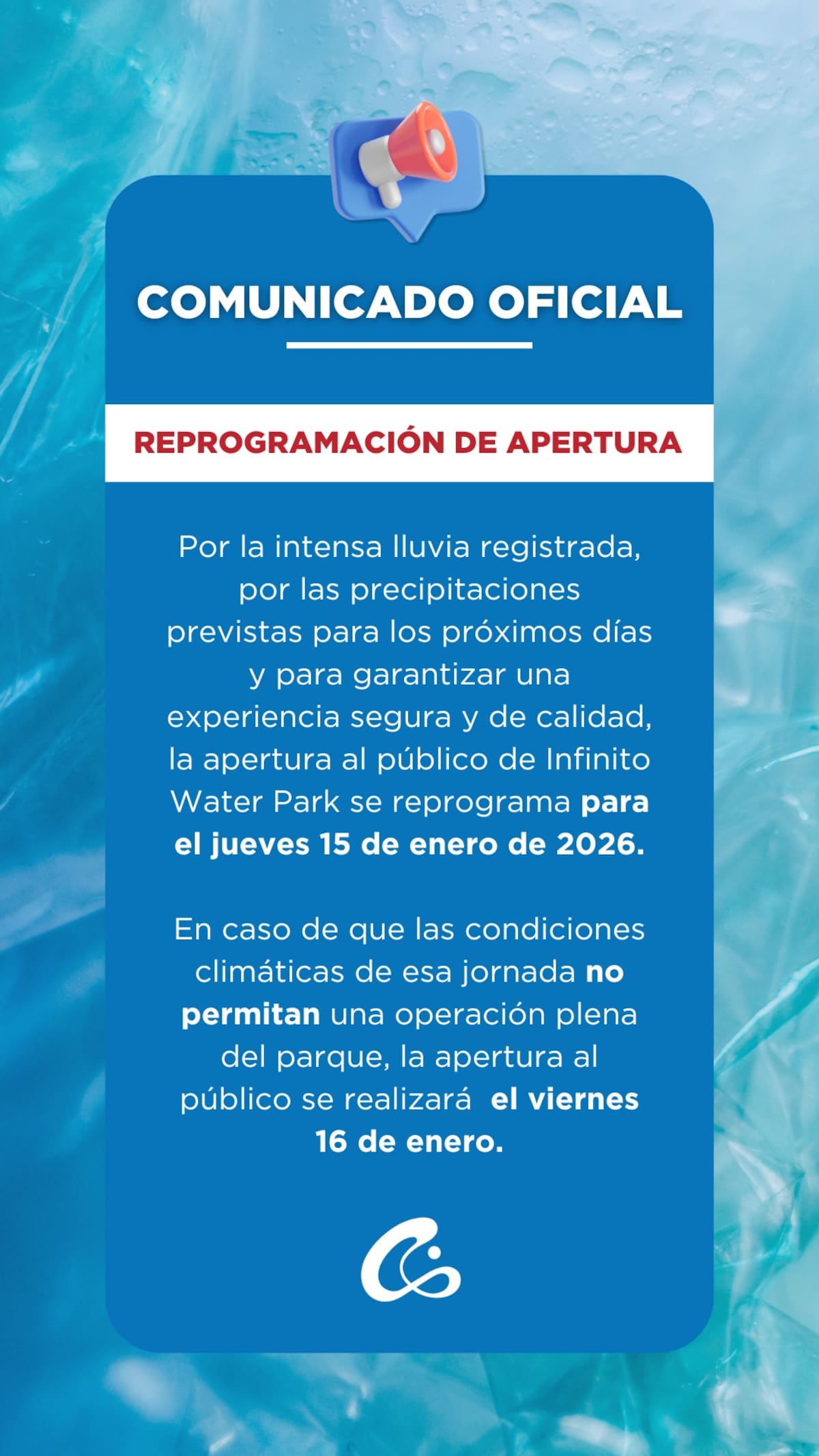 El parque acuático más grande de la Argentina, Infinito Water Park, ajustó otra vez su cronograma oficial y reprogramó su fecha de apertura para el jueves 15 de enero, la primera postergación se había pasado del 3 de enero al sábado 10 de enero de 2026. El megaproyecto que tuvo una inversión de 40 millones de dólares, tendrá más de 50 atracciones y una capacidad para 12.500 visitantes simultáneos.