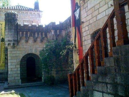 El exterior también refuerza su estética: un jardín cuidado al detalle y una gran roca con una espada incrustada, símbolo claro del espíritu medieval que atraviesa toda la construcción.