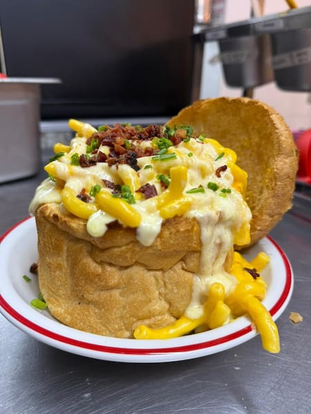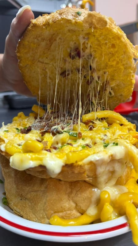 Se trata de un exquisito pan casero de masa madre, relleno con macarrones con queso cheddar, un baño de mozzarella caliente y una lluvia de panceta y ciboulette.
