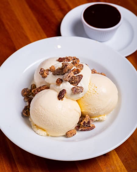 - HOT FUDGE SUNDAE (helado de vainilla bañado con salsa de chocolate, crema y pecans acarameladas): $17.000