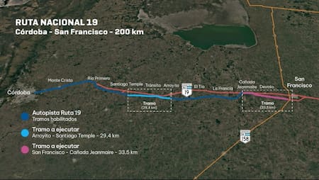 Entre las obras previstas también figura la construcción de un puente de 150 metros sobre el río Segundo para una de las calzadas, junto con intervenciones hidráulicas en distintos puntos del trazado. El primer tramo en ejecución comprende 29,4 kilómetros, entre las localidades de Arroyito y Santiago Temple, donde se realizarán tareas de ampliación de carriles y repavimentación.