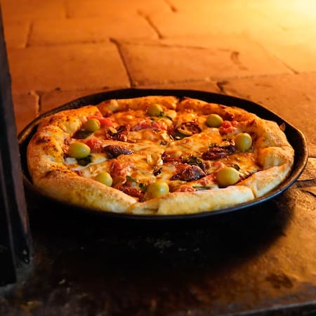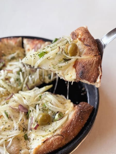 - Fugazzetta rellena (doble masa de Roma, con muzzarella, queso azul, cebolla blanca, morada y de verdeo, aceite de oliva extra virgen y aceitunas verdes): $31500
