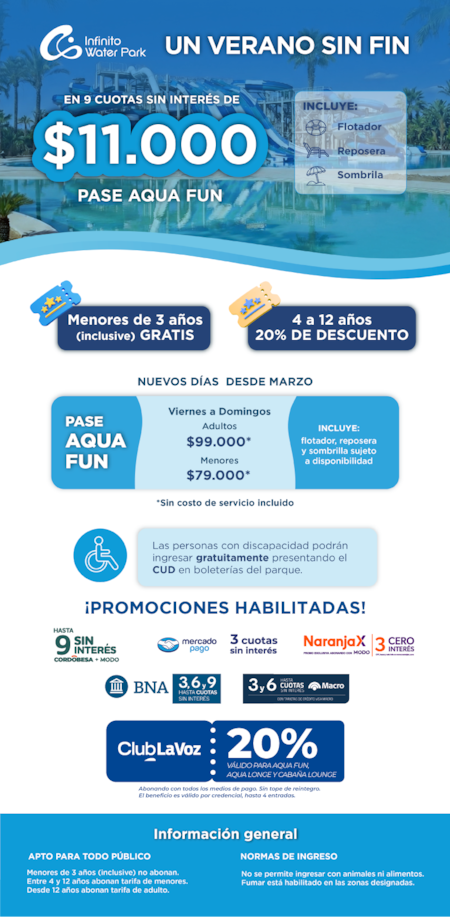 Infinito Water Park funciona de viernes a domingo de 11 a 20 hs. Las entradas pueden comprarse a través de su sitio web oficial (clic acá). En cuanto a precios, el pase Aqua Fun para menores de 4 a 12 años sale $79.000, mientras que la entrada para adultos tiene un valor de $99.000. Este boleto incluye flotador, reposera y sombrilla (sujeto a disponibilidad). En tanto, los menores de 3 años (inclusive) entran gratis.