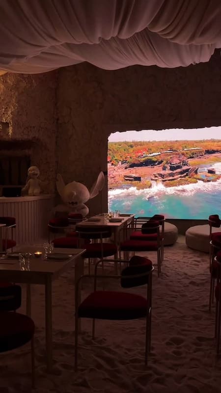 El sector Playa también cuenta con esculturas de Lilo & Stitch que refuerzan el clima playero y una pantalla gigante donde se proyectan paisajes de sol, playa y mar. El diseño fue pensado especialmente para que los clientes puedan desconectarse y disfrutar de un atardecer diferente.