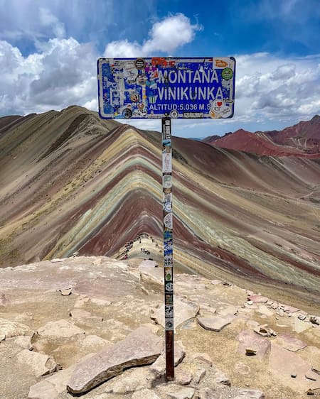 Se trata de Vinicunca, también conocida como la Montaña de Siete Colores o Montaña Arcoíris. Esta impactante cumbre andina está ubicada a 5.036 metros sobre el nivel del mar, en la región de Cusco, Perú. Su fama mundial se debe a las franjas naturales de colores —rojos, verdes, amarillos y lavanda— que se formaron por la presencia de minerales en el suelo y el efecto de la oxidación a lo largo de miles de años.