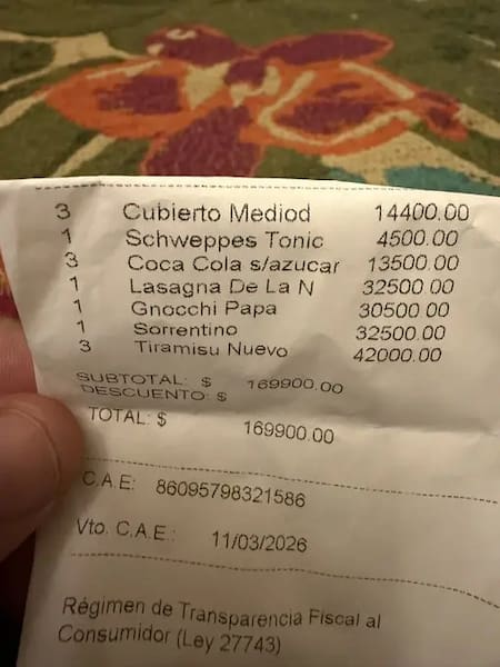 El cierre dulce del almuerzo —tres porciones de tiramisú— elevó la cuenta en $42.000, reforzando la idea de que incluso opciones tradicionales italianas tienen un costo destacado en establecimientos de categoría.