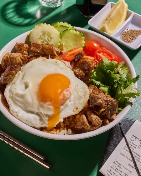 Entre los platos principales, uno de los más pedidos es el Bo Luc Lac: cubos de ojo de bife marinados y salteados a la manteca, acompañados con su clásica salsa, huevo frito, tomates cherry, pepino y cilantro.