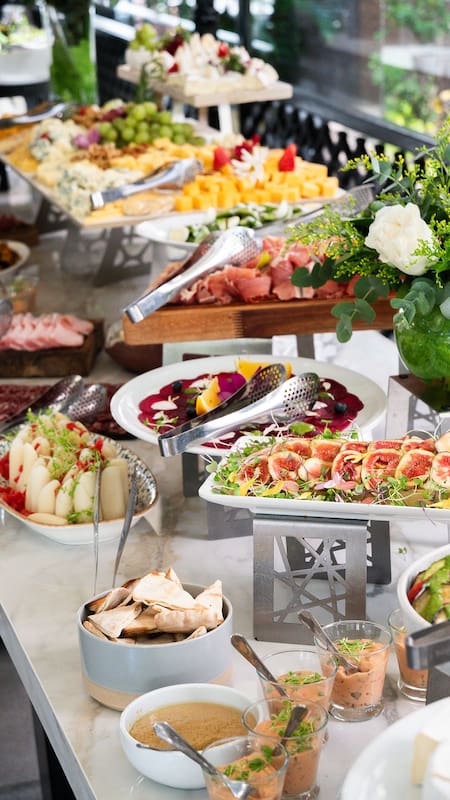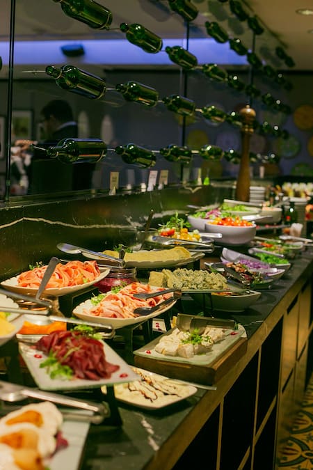Arranca con una mesa de fiambres y quesos artesanales -porchetta, bresaola, jamón crudo serrano, mortadela con pistachos, gorgonzola, camembert y cacciocavallo, entre otros- acompañada de chutneys y conservas. Le siguen preparaciones frías como vitello tonnato, ceviche de camarón y palta, salmón ahumado con crema de salmoriglio, y una variedad de ensaladas con ingredientes de estación.