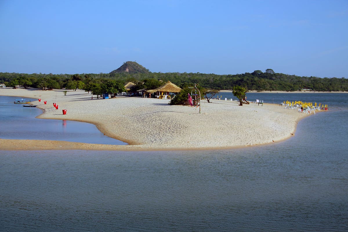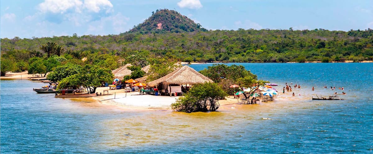 Uno de los mayores atractivos de Alter do Chão es su playa principal, conocida como Ilha do Amor, una extensa franja de arena blanca bañada por las aguas cristalinas del río Tapajós. A diferencia del mar, este río ofrece aguas calmas y temperatura agradable, perfectas para entrar sin esfuerzo o simplemente relajarse a la orilla.