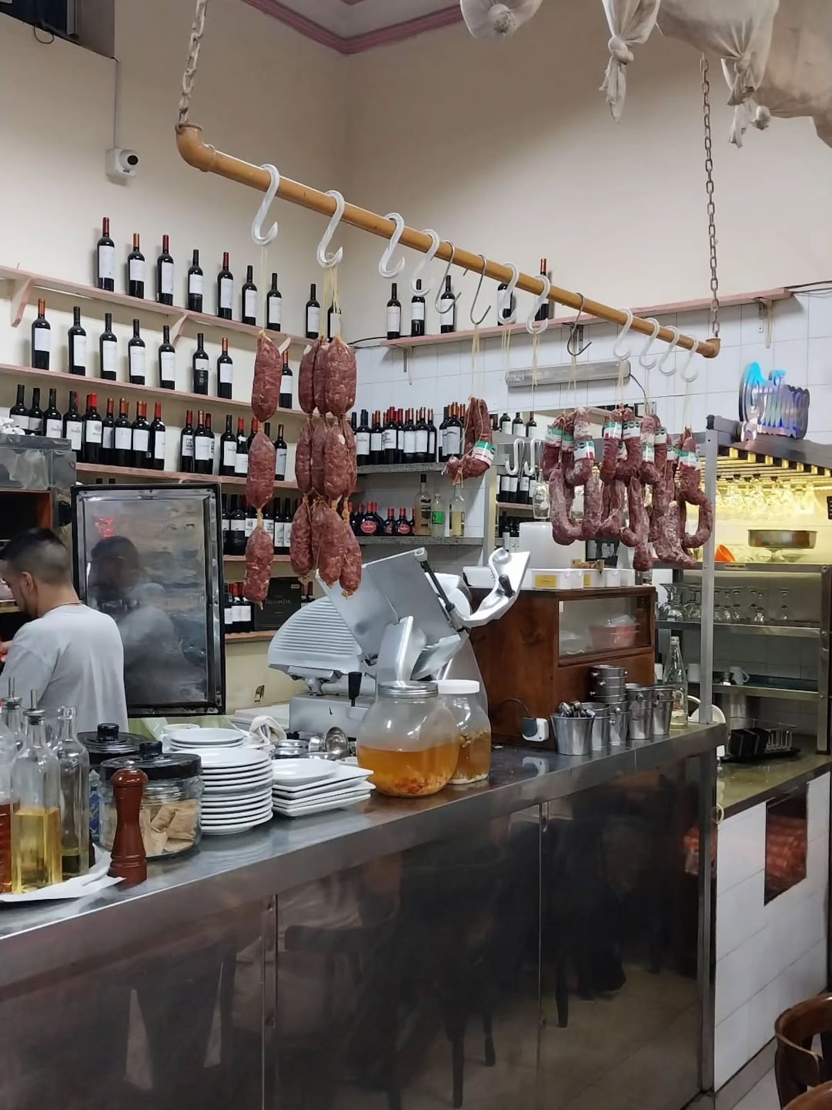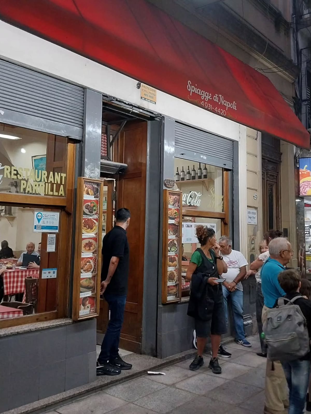 A diferencia de otros locales históricos que fueron remodelados para “parecer antiguos”, Spiagge di Napoli es auténticamente lo que siempre fue. Mesas simples, botellas en repisas altas, mozos de oficio y una dinámica intensa que no busca silencio ni solemnidad.