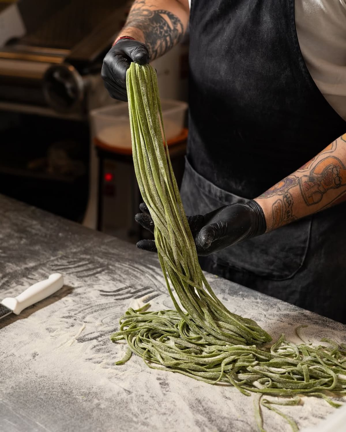 El espacio combina una estética moderna y minimalista, con tonos blancos y negros y grandes ventanales que permiten ver en vivo la elaboración de las pastas. Además, cuenta con góndolas de productos italianos e ingredientes seleccionados: harinas, aceites de oliva, conservas, quesos y vinos de bodegas boutique nacionales, completando una experiencia gastronómica integral.